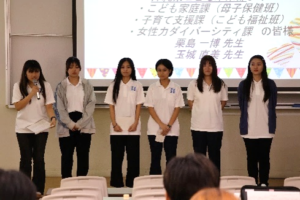 その後、5つのチームから、各取り組みについての成果報告が行われました。各チームでは、この約4カ月の間、パートナーシップ機関の担当者から現場の実情を学び、課題の解決策についての助言を受け、学生なりにどのように課題を解決できるのかをチームのメンバー間で話し合い、議論し、真剣に模索しました。