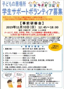 11月10日(日)に沖縄大学・3号館 3-102教室(1階)で、第3回目の事前研修会を開催いたします。。子どもの居場所学生ボランティアセンターへ学生サポートボランティアとして登録するためには、事前研修会を受ける必要があります。また、今回の研修会が今年度中の最後の研修会になる可能性があります。