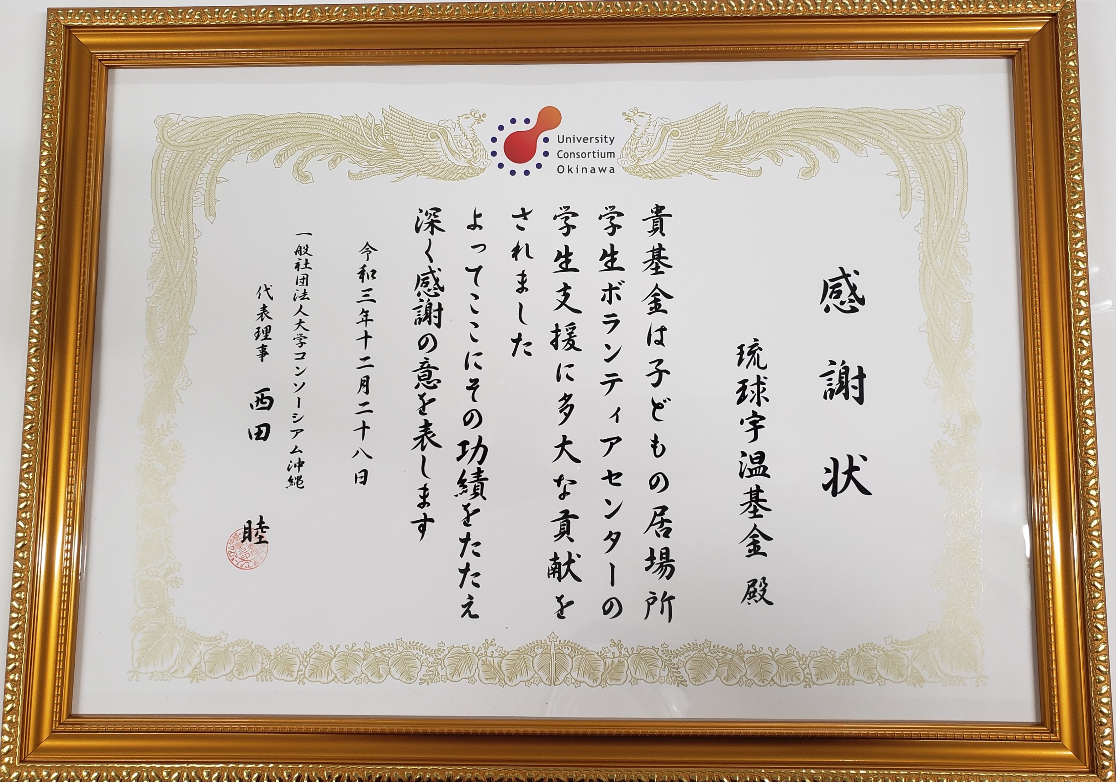 令和3年12月28日、一般社団法人大学コンソーシアム沖縄は、琉球宇温基金から助成を受けました。令和元年度から3回目の助成となります。