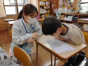 - 今回離島派遣で一番印象に残ったことがあります。3日目、海外からきたという兄弟がいました。日本語は少ししかわからず、家では母国語や英語で会話をしているとのことでした。姉の方は、受験するのをやめたと聞いていましたが、兄妹2人とも数学に取り組んでいました。その姉との会話の中で「先生は何歳?」「どこの大学行ってるの?」「大学で何を勉強しているの?」と聞かれ、「琉球大学で看護の勉強をしているよ。」と答えると、「私も将来看護師になりたい。だけど、日本語も上手じゃないし、大学に通うのもお金がかかるから…」と話してくれました。私は、「確かに日本語で授業することは多いし、大学行くためにお金もかかると思うけど、授業スライドに英語しか書かれていないこともあって、英語を話すことができる医師や看護師免許を持つ先生も多いから、わからないことがあったら英語で聞くことができるよ。奨学金を借りることができて、自分もそれで学費を賄っているし、普段はバイトしながら学校に行ってるよ。」と言うと、「本当に?」ととても嬉しそうでした。少しでも将来の夢のために頑張る手助けができたかなと思い、嬉しかったです。