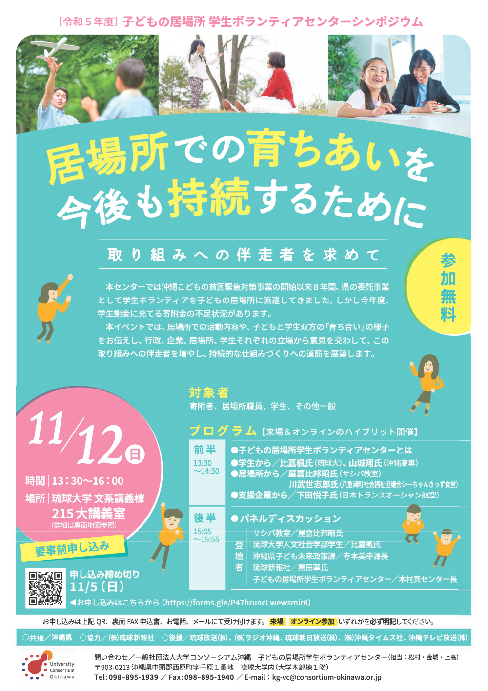 本センターは、沖縄こどもの貧困緊急対策事業として学生ボランティアを子どもの居場所へ派遣し、8年目を迎えます。本イベントでは、居場所の子ども達と学生の双方向の育ちあいの場となる活動の様子をご紹介し、また県内企業の取り組みや、琉球新報社にご協力いただきマスコミの広い視点を参考に、支援現場の持続性について関係者とディスカッションを行います。当事業の伴走者となっていただける仲間の拡充を目指したいと思います。皆様のご参加お待ちしています!