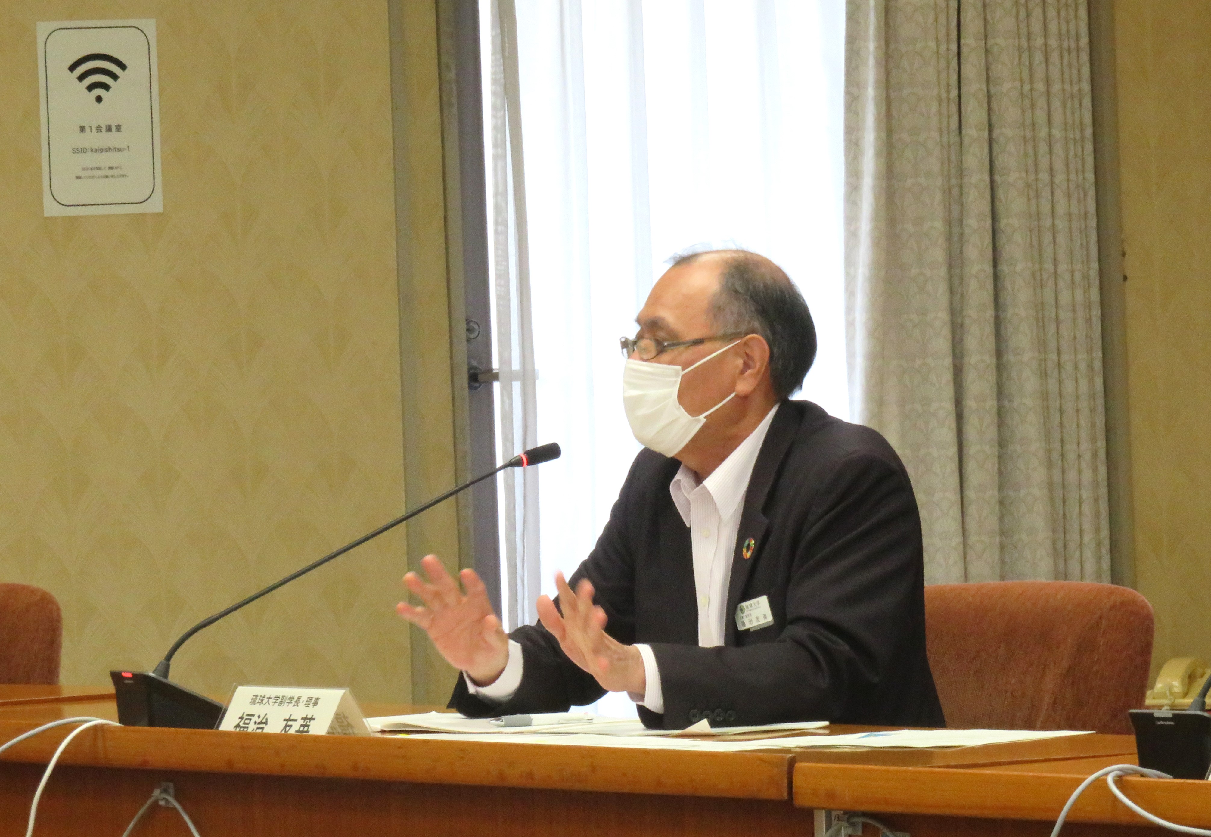 視察の冒頭、西銘委員長から開会と挨拶が行われ、その後、大学コンソーシアム沖縄代表理事の西田睦琉球大学長が挨拶を行いました。続いて、本村真ボランティアセンター長から、事業概要の説明と、参加した名桜大学の学生の小倉愛美さんと琉球大学の学生の玉榮太一さんから、子どもの居場所での活動の様子が紹介されました。