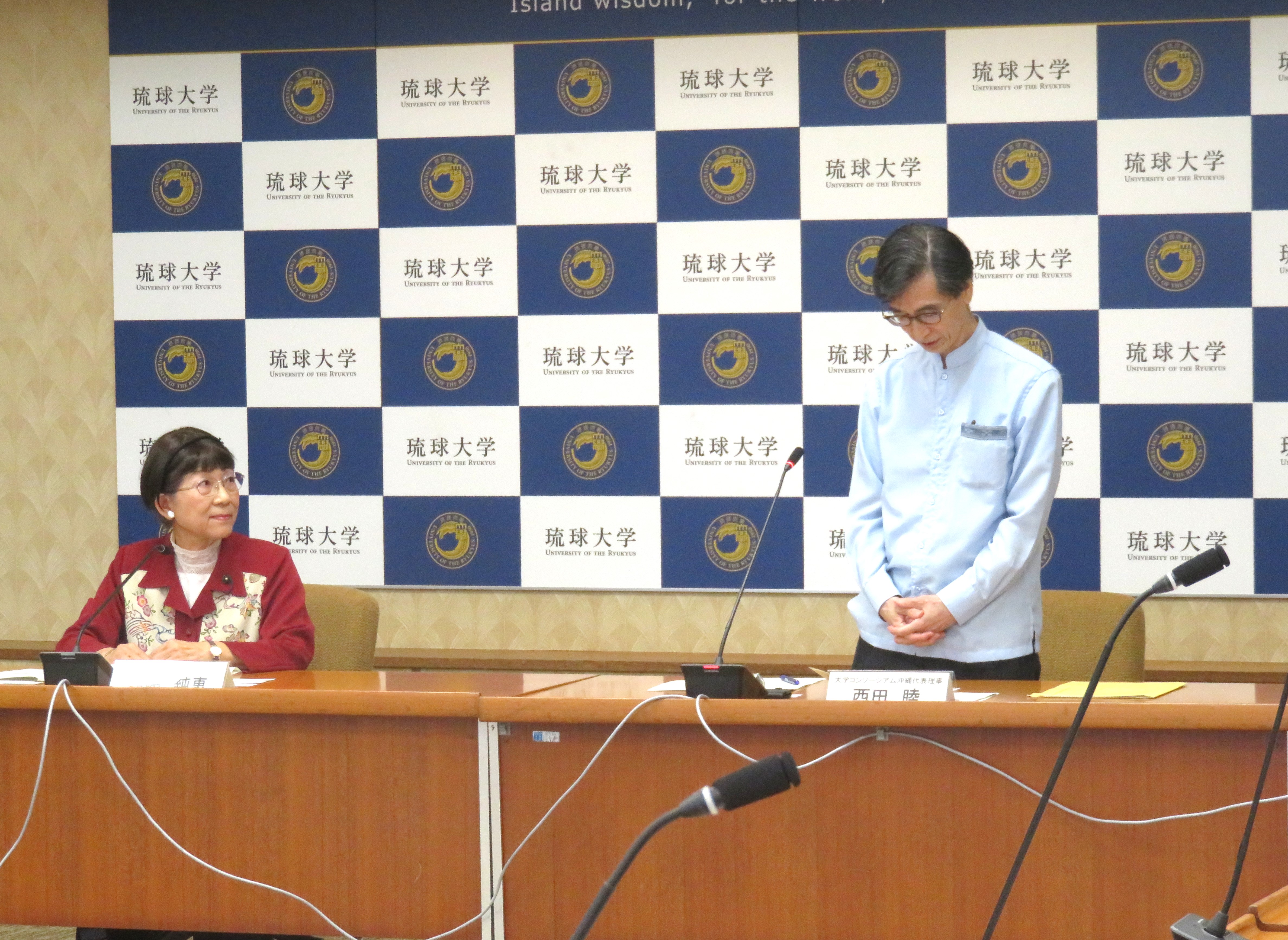 大学コンソーシアム沖縄:西田睦代表理事、福治友英琉大理事・副学長、本村真センター長、小倉愛美(学生)、玉榮太一(学生)