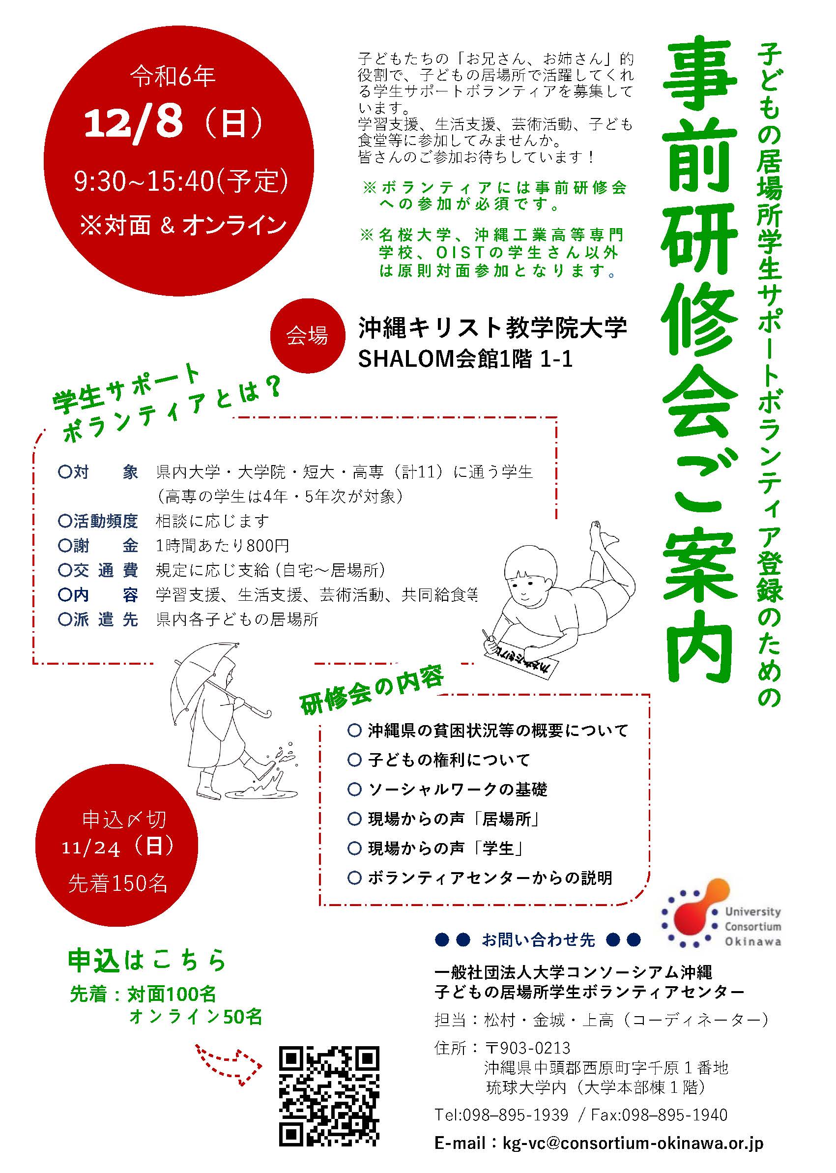 大学コンソーシアム沖縄に加盟所属している11の大学・大学院・短大・高専(琉球大学、沖縄キリスト教短期大学、沖縄キリスト教学院大学、沖縄大学、沖縄女子短期大学、沖縄国際大学、沖縄県立芸術大学、名桜大学、沖縄県立看護大学、沖縄工業高等専門学校、沖縄科学技術大学院大学〈OIST〉)の学生の皆様、県内各地子どもの居場所でボランティア活動をしてみませんか?