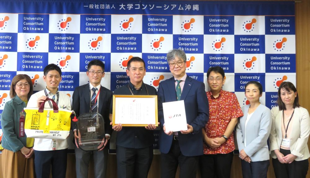 日本トランスオーシャン航空株式会社様(以下JTA様)から、一般社団法人大学コンソーシアム沖縄が運営する子どもの居場所学生ボランティアセンターの「学生ボランティアコーディネート事業」へ、アップサイクル製品の売上によるご寄附をいただきました。