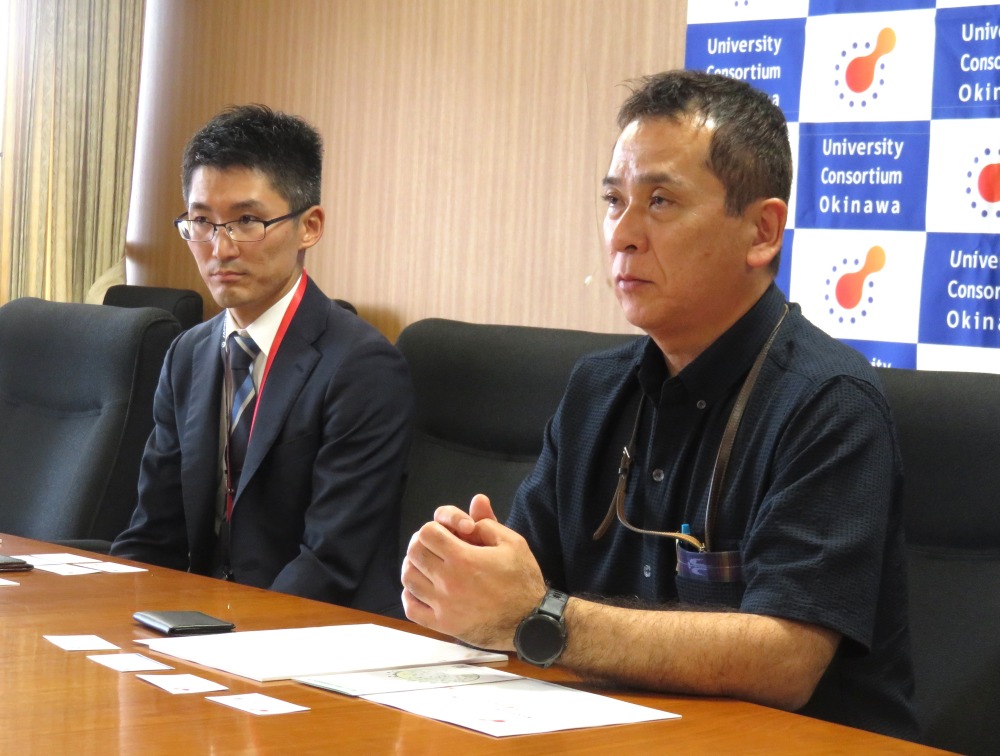 JTA執行役員 整備部門長 義田寛様より「地元の企業として、今後もこういった活動を通して沖縄県への貢献を進めていきたいと考えます。また今回の寄附金を、ボランティア学生の皆様が、有効にご活用下さることを祈念いたします。今後とも同様な形で支援できるように、我々一同も頑張って参ります」とのお言葉をいただきました。その後、義田部門長より子どもの居場所学生ボランティアセンター長 田中寛二へ目録が手渡され、田中センター長から義田部門長へ感謝状を贈らせていただきました。