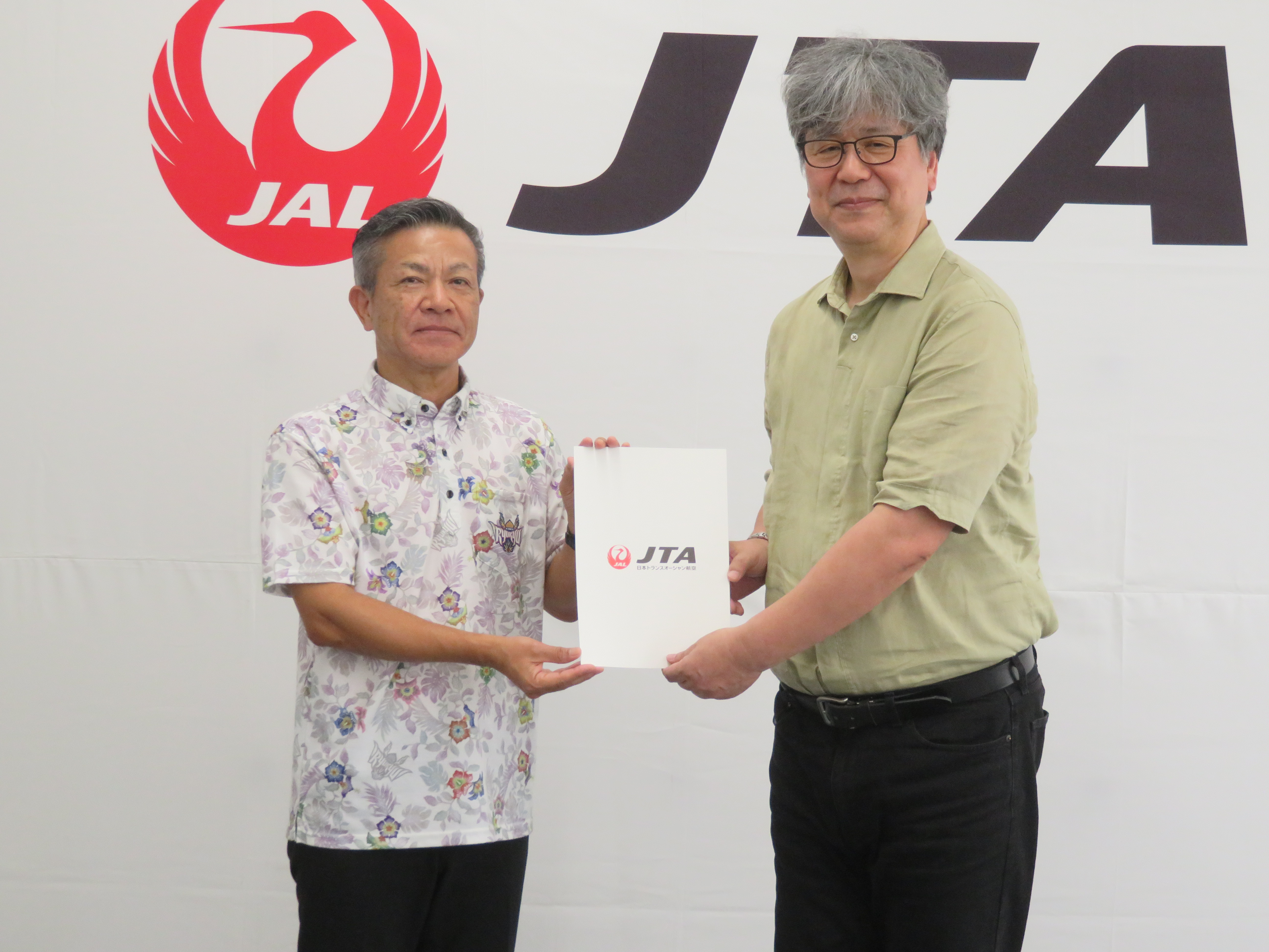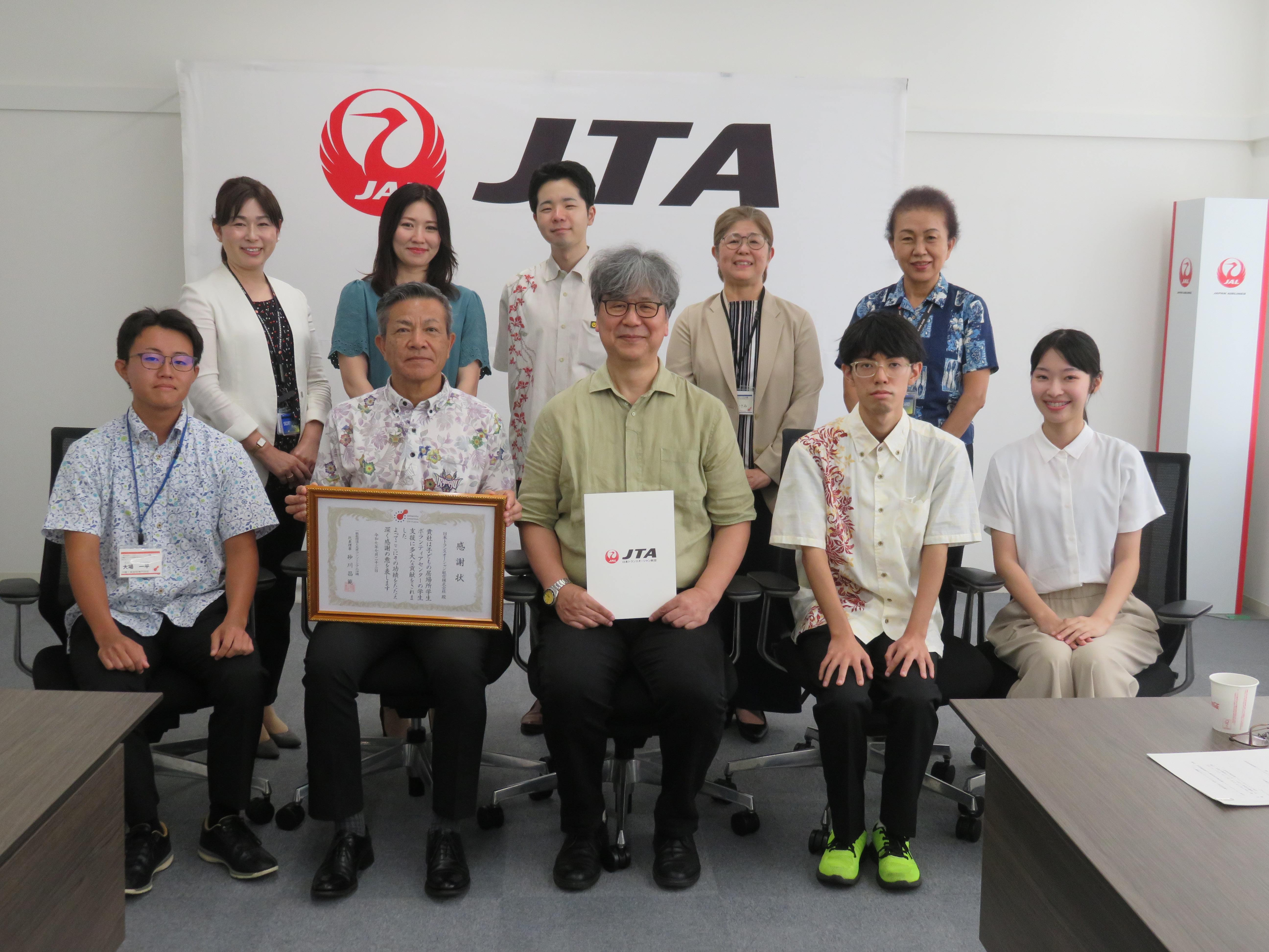 日本トランスオーシャン航空株式会社(以下JTAと表記)様から、一般社団法人大学コンソーシアム沖縄が運営する子どもの居場所学生ボランティアセンターの令和7年度離島派遣事業へ航空券のご寄附があり、令和7年7月23日に、JTA 地域業務部門長 波照間弘光様をはじめとする関係者の皆様と、過去に離島に派遣された学生3名が出席して、寄附贈呈式を執り行いました。
