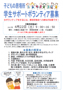 2017年4月22日(土)に沖縄県立看護大学 教育管理棟(4階中会議室)で今年度第一回目の事前研修会を開催いたします。子どもの居場所学生ボランティアセンターへ学生サポートボランティアとして登録するためには、事前研修会を受ける必要があります。この機会にぜひご参加ください♪