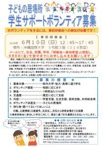子どもの居場所で、学生のみなさんは大きな力を発揮します。子どもたちは、お姉さん、お兄さんが大好きです。こども達の「一緒に遊んで楽しい」「話して分かってもらえた」という経験が、子どもたちの生きる力に繋がります。みなさんのお力を貸して下さい!