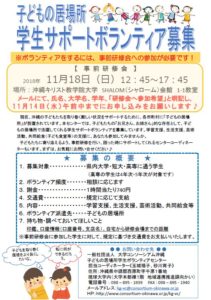 大学コンソーシアム沖縄に加所属している11の大学・短大・高専(名桜大学、沖縄工業高等専門学校、OIST、琉球大学、キリスト学院大学、キリスト短期大学、沖縄国際大学、沖縄大学、沖縄県立芸術大学、沖縄県立看護大学、沖縄女子短期大学)の学生の皆様、県内各地にある子どもの居場所でボランティアをしてみませんか?